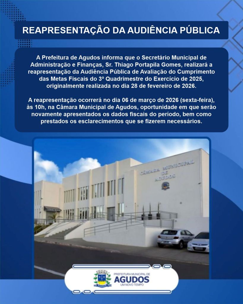 A Prefeitura de Agudos convida toda a população para a reapresentação da Audiência Pública de Avaliação do Cumprimento das Metas Fiscais do 3º Quadrimestre de 2025.