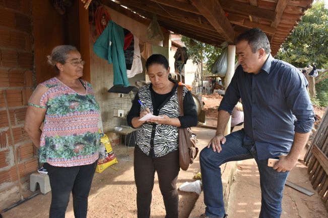 moradora Maria de Lurdes relata sua satisfação com o aterramento da área onde fica sua casa, junto ao prefeito Altair
