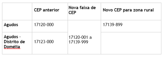 A partir de 3/10/18, o município de Agudos/SP – incluindo o Distrito de Domélia - contará com Código de Endereçamento Postal – CEP por logradouro. Cada quadra, rua, alameda, viela, avenida e travessa passará a ter CEP individual, conforme quadro a seguir: