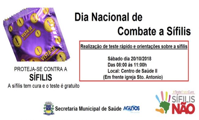 A Prefeitura de Agudos, através da Secretaria municipal de Saúde, fará neste sábado, dia 20 de outubro/2018, teste rápido de combate à Sífilis e dará orientações sobre a doença sexualmente transmissível. A ação da Secretaria de Saúde será realizada no Centro de Saúde da Rua 07 de Setembro, no horário das 8h às 11h. O teste é gratuito e fundamental, pois a Sífilis tem cura, através de tratamento adequado.