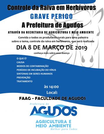 A Secretaria de Meio Ambiente da Prefeitura de Agudos promove no próximo dia 8 de março, a palestra "Controle de Raiva" em Herbívoros com destaque para os perigos que a doença representa para os criadores. O encontro será realizado no auditório da FAAG, às 14h.