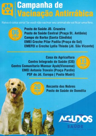 A Prefeitura de Agudos, por meio do Setor de Vetores da Secretaria de Saúde realiza, no mês de julho, a Campanha de Vacinação Antirrábica, que vai imunizar gratuitamente os animais de estimação de toda a população.
