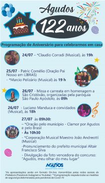 “Esse é momento de cuidarmos um dos outros, por isso, infelizmente, não poderemos festejar da forma que gostaríamos. Mas, temos muito a comemorar por nossa cidade. Por isso, preparamos uma programação que vai chegar a toda população de Agudos e, assim, de certa forma, estaremos juntos neste aniversário de 122 anos”, disse o prefeito Altair Francisco Silva.