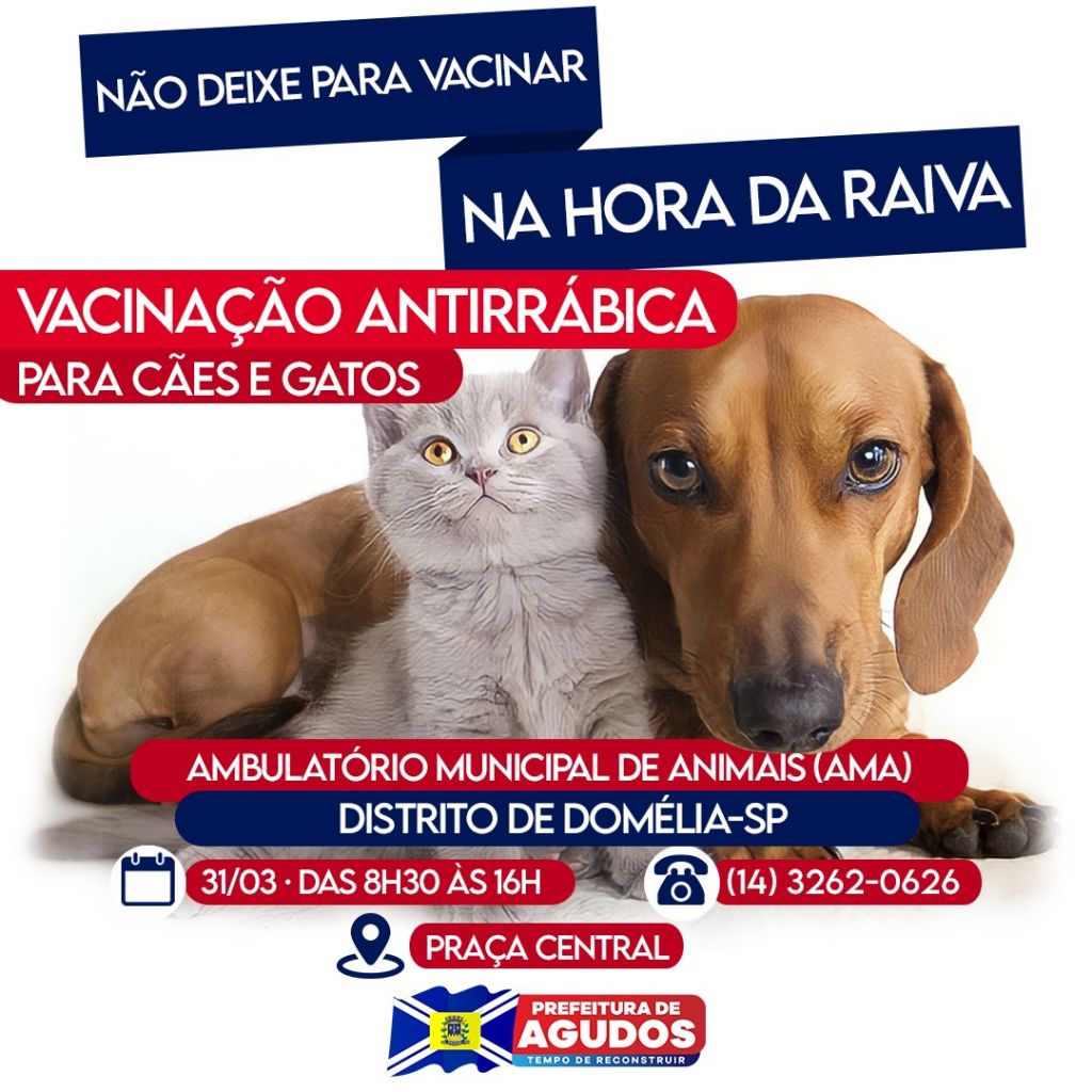 A Prefeitura de Agudos, através do AMA (Ambulatório Municipal de Animais) promove nesta quarta-feira (31) a Vacinação Antirrábica para cães e gatos no distrito de Domélia. A vacinação é gratuita e destinada para animais a partir de 4 meses.