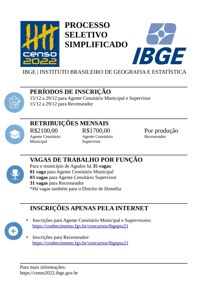 O IBGE publicou editais para contrato temporário de pessoas para trabalhar no Censo Demográfico 2022. Em Agudos serão oferecidas 31 vagas para recenseador, 3 para agente censitário supervisor (ACS) e 1 para agente censitário municipal (ACM). As inscrições do Processo Seletivo Unificado começaram no último dia 15 e vão até 30 de dezembro.
