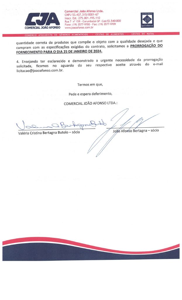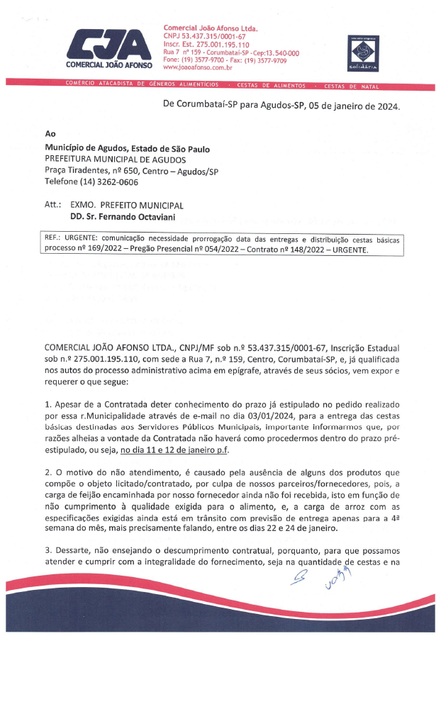 A decisão de prorrogar a entrega foi tomada em resposta a um pedido formal da empresa Comercial João Afonso, vencedora da licitação para fornecimento das cestas. A empresa justifica a necessidade de prorrogação devido à ausência de alguns produtos essenciais que compõem a cesta, conforme comunicado oficial enviado à prefeitura em 5 de janeiro.