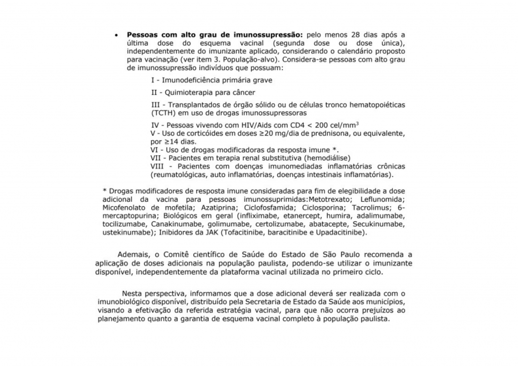 Pacientes imunossuprimidos devem estar enquadrados nos critérios estabelecidos pelo Ministério da Saúde (lista abaixo).