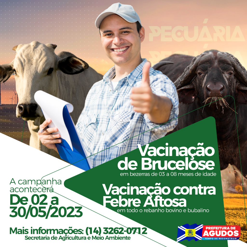 A Secretaria de Agricultura e Meio Ambiente da Prefeitura de Agudos informa que no mês de maio será realizada a campanha de vacinação contra Brucelose em bezerras de 03 a 08 meses de idade e Aftosa em todo rebanho bovino e bubalino do município. A campanha inicia no dia 2 e vai até o dia 30 de maio.