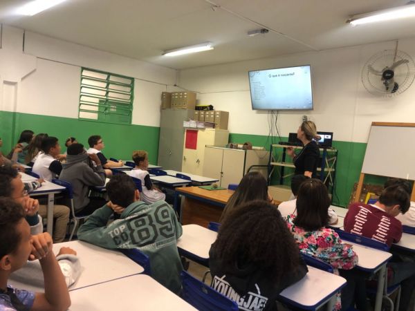 A Bióloga Francine apresenta palestra aos alunos
