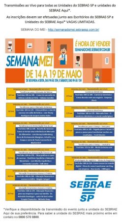 Uma novidade desse ano, na Semana do MEI, serão as palestras realizadas na sede do Sebrae-SP em São Paulo, e que serão transmitidas para todos os escritórios regionais e para as unidades municipais do Sebrae Aqui, com expectativa de alcance de mais de 35 mil participantes durante a semana. Para assistir as palestras online no Sebrae Aqui Agudos, basta se inscrever pessoalmente na Rua Treze de Maio, nº 232, aberto aos empreendedores, de segunda a sexta, das 8h às 12h e das 13 às 17 h, e também pelo telefone 3261 1497.