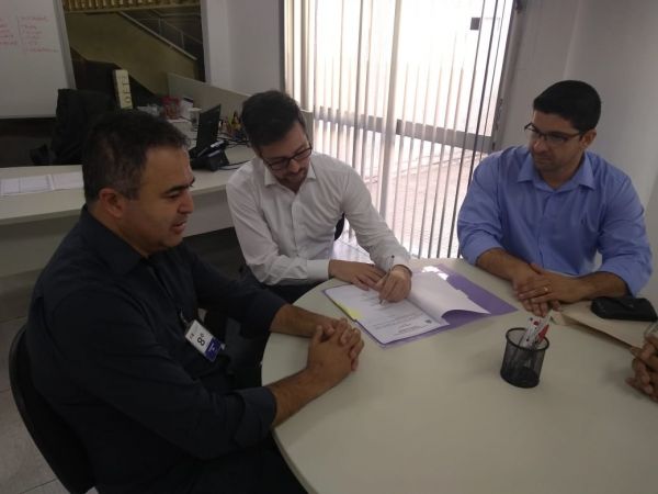 presidente do FDE, Luiz Sobral, assinando convênio para construção da nova Creche Berçário, junto ao prefeito Altair e ao secretário Rafael Lima