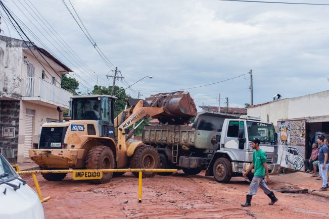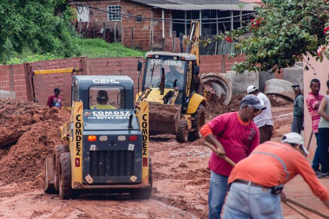 Funcionários e máquinas da Prefeitura, com a ajuda também de máquinas da empresa Ecovita, estão realizando uma limpeza “pesada” na Rua Miguel Leão, para a retirada de lama que se acumulou no trecho onde estão sendo feitas obras de infraestrutura, com colocação de galerias e construção de bocas de lobo, a fim de resolver definitivamente os problemas de alagamento, por ocasião de chuvas.