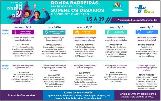 No último dia da Semana do Empreendedor, dia 19/10, as palestras serão sobre “Presença Digital”, pela manhã o tema abordado será “Impulsione suas vendas com Marketing Digital” e à tarde “Como a digitalização impulsiona os pequenos negócios”.