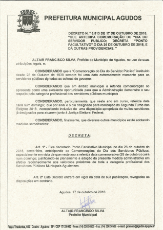 Ponto Facultativo Municipal no dia 26 de Outubro de 2018