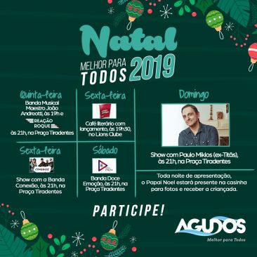 A programação do Natal Melhor para Todos 2019, em Agudos, continua nesta quinta-feira, dia 19 de dezembro, com grandes shows para toda a população na Praça Tiradentes. O evento é organizado pela Prefeitura de Agudos.