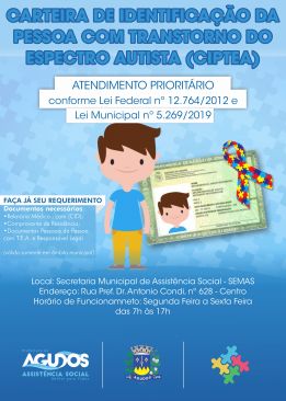 A Prefeitura de Agudos, por meio da Secretaria de Assistência Social, passou a fornecer, a partir desta quarta-feira, dia 22 de janeiro, a Carteira de Identificação da Pessoa com Transtorno do Espectro Autista (CIPTEA), dando acesso a atendimentos prioritários a essas pessoas no município.