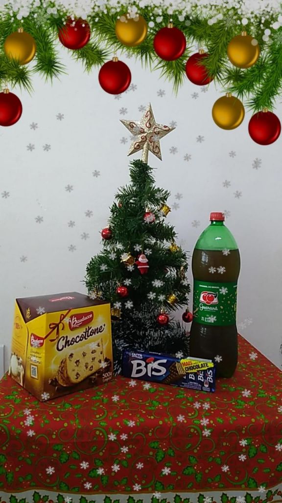 O Kit Natalino é composto por um chocotone, um refrigerante de dois litros e uma caixa de chocolate Bis, todos produtos de alta qualidade.