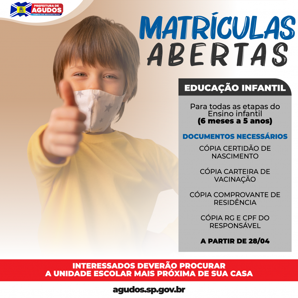 A Secretaria de Educação da Prefeitura de Agudos abre nesta quarta-feira (27) as matrículas para todas as etapas da Educação Infantil da rede municipal (6 meses a 5 anos) para o ano letivo 2021.