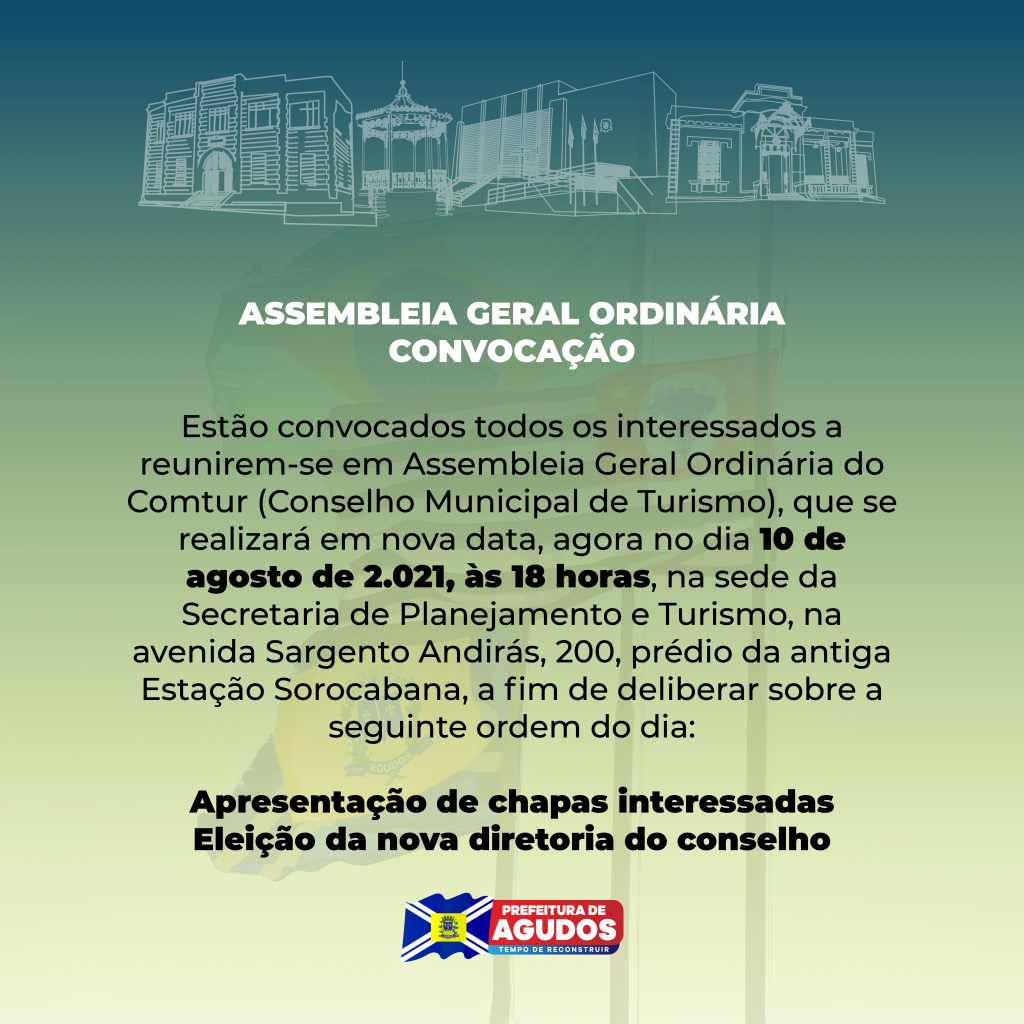 Estão convocados todos os interessados a reunirem-se em Assembleia Geral Ordinária do Comtur (Conselho Municipal de Turismo), que se realizará em nova data, agora no dia 10 de agosto de 2.021, às 18 horas, na sede da Secretaria de Planejamento e Turismo, na avenida Sargento Andirás, 200, prédio da antiga Estação Sorocabana, a fim de deliberar sobre a seguinte ordem do dia: