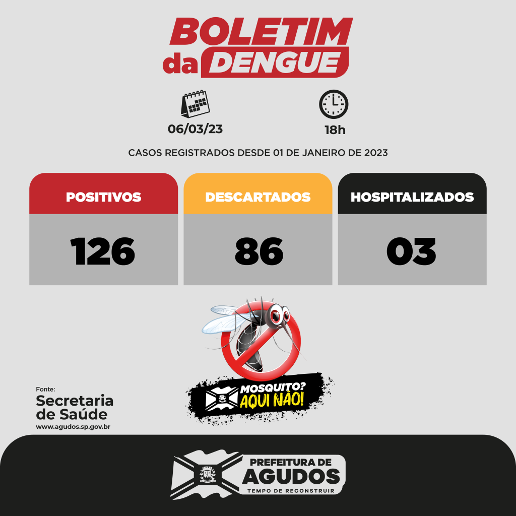 Com o objetivo de orientar a população e alertar sobre a necessidade de combate do mosquito Aedes aegypti, transmissor da dengue e de outras doenças, o município de Agudos adota a partir desta segunda-feira (06/03) o Boletim da Dengue. Divulgado semanalmente, o boletim contará com informações referentes à doença no município, incluindo o número de casos positivos, descartados e hospitalizados.
