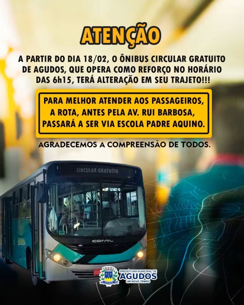A PARTIR DO DIA 18/02, o ônibus circular gratuito de Agudos, que opera como reforço no horário das 6h15, terá alteração no seu trajeto.