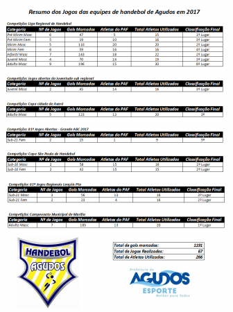 A Secretaria de Esportes da Prefeitura de Agudos, promoveu em 2017, sessenta e sete partidas na modalidade de Handebol e atendeu 266 atletas de diferentes idades que puderam participar de diversas competições locais e regionais, entre elas, os Jogos Abertos na grande ABC/São Paulo, Jogos Abertos da Juventude e Jogos Regionais.